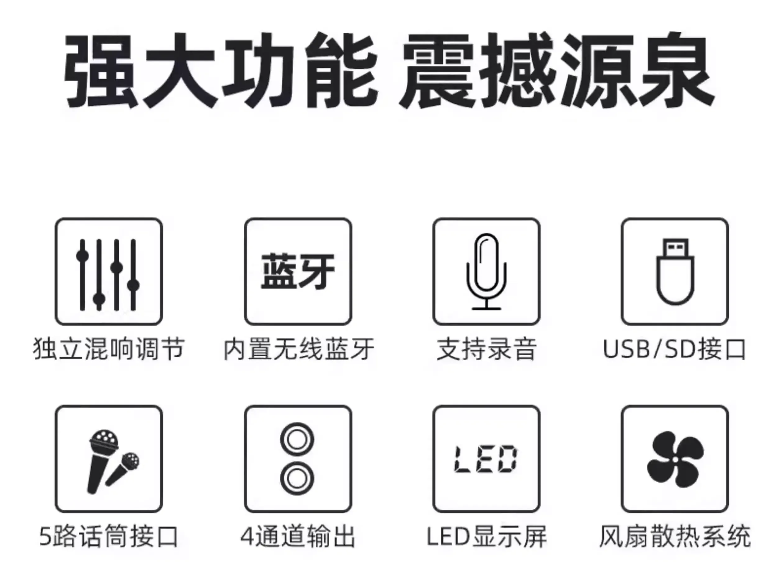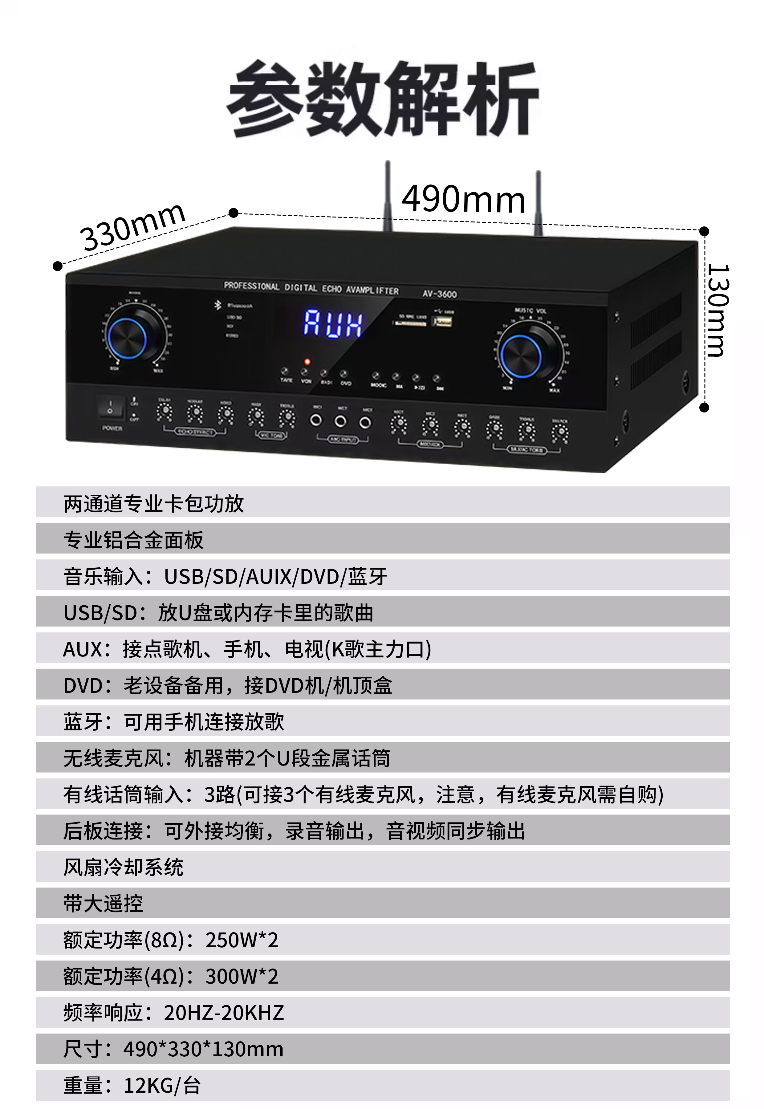 帶來專業錄音棚級音質,輕鬆打造家庭KTV體驗 多種輸入方式:USB/SD/AUX/DVD/藍牙,輕鬆連接點歌機、手機、電視,舊設備亦可使用 無線+有線麥克風支援:附2支U段金屬無線麥克風,3路有線麥克風輸入(自備) 豐富擴展接口:後板支援均衡、錄音輸出、影音同步輸出 高效散熱與便利操作:風扇冷卻系統+大型遙控器,長時間使用更安心 強勁功率:250W×2 (8Ω) / 300W×2 (4Ω),頻率響應20Hz–20kHz,完美還原音樂細節 尺寸適中:490×330×130mm,重量12kg/台,輕鬆安置家中 💡家庭聚會、K歌娛樂、派對必備,專業音質輕鬆擁有