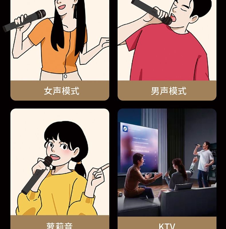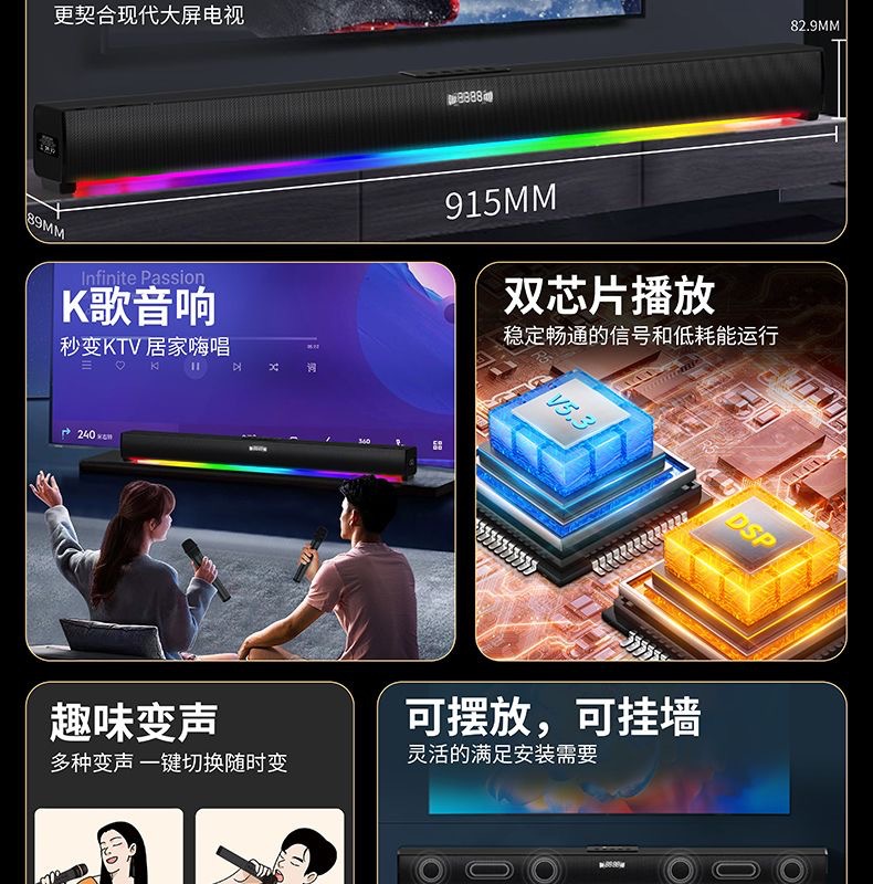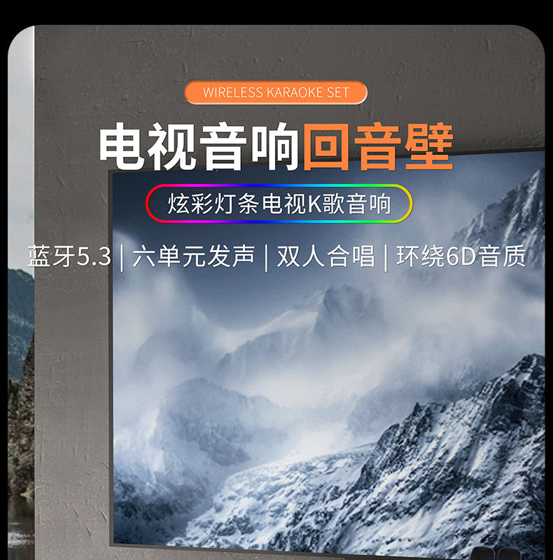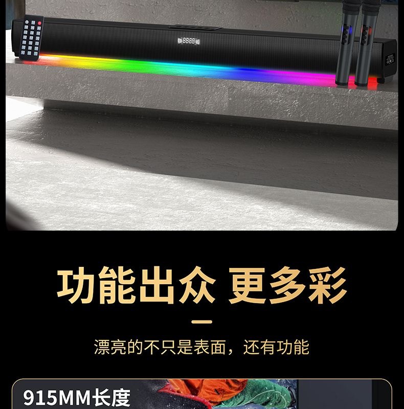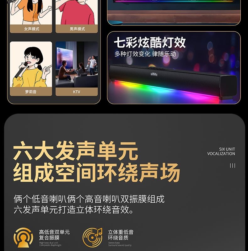 --六单元发声;环绕6D音质 --七彩灯效随音乐律动 --配备两支麦克风【颜色黑色/银色随机】 --升级915MM,可摆放可挂墙 --趣味变声功能,增加K歌乐趣 --支持TF卡/U盘扩容
