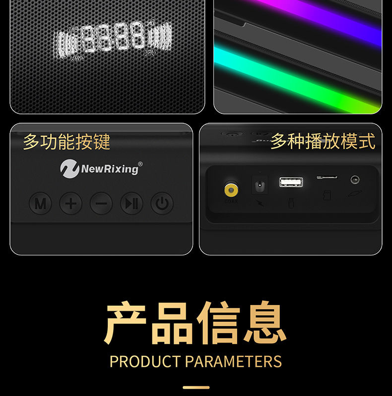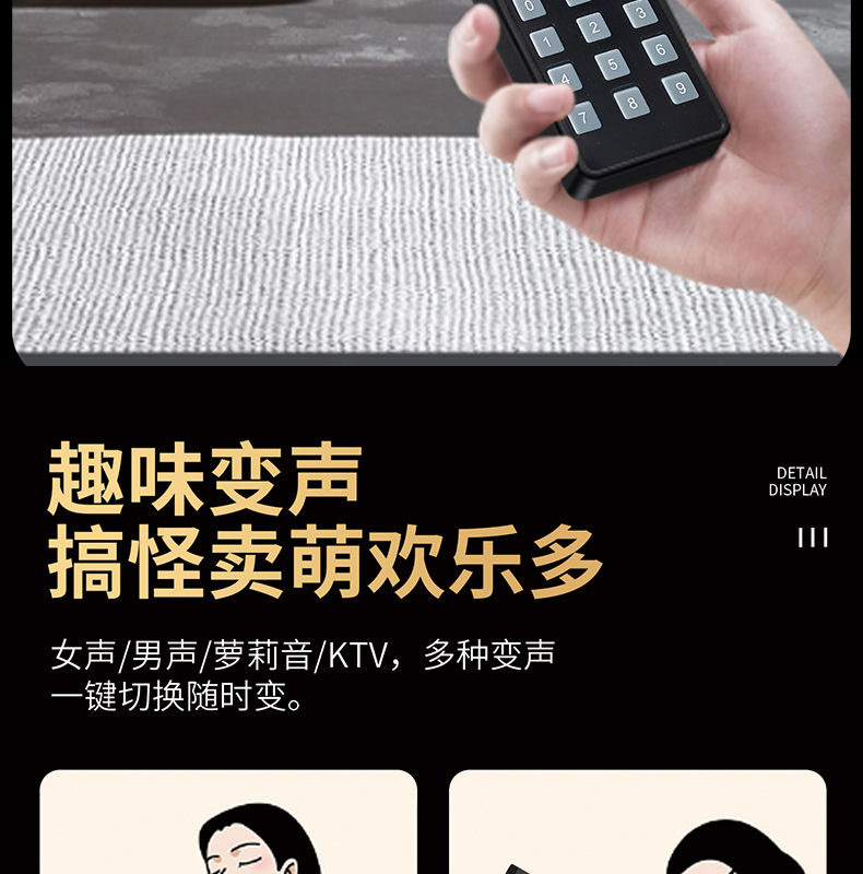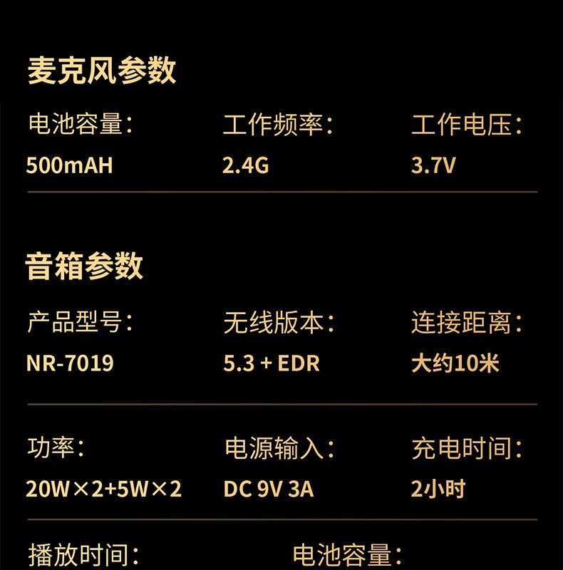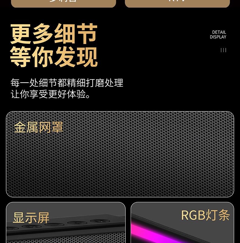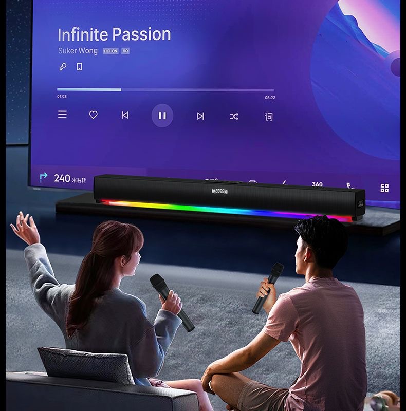 --六单元发声;环绕6D音质 --七彩灯效随音乐律动 --配备两支麦克风【颜色黑色/银色随机】 --升级915MM,可摆放可挂墙 --趣味变声功能,增加K歌乐趣 --支持TF卡/U盘扩容