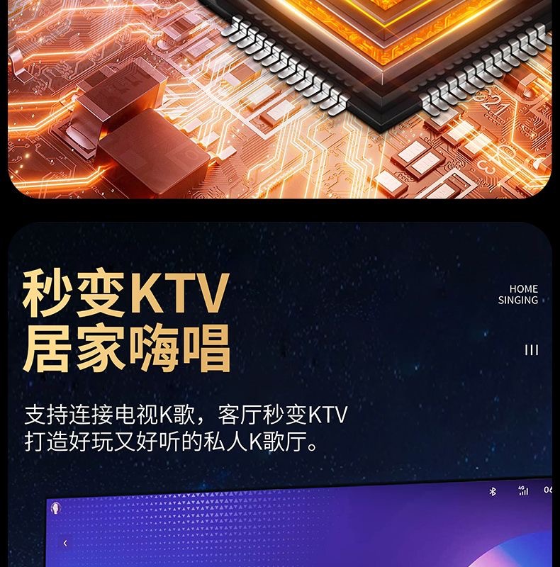 音响一体式点歌机;自带音响麦克风,连接屏幕即可开唱;内置K歌系统;可唱歌;可看剧;语音点歌/手机扫码/遥控点歌;在家即可实现K歌自由
